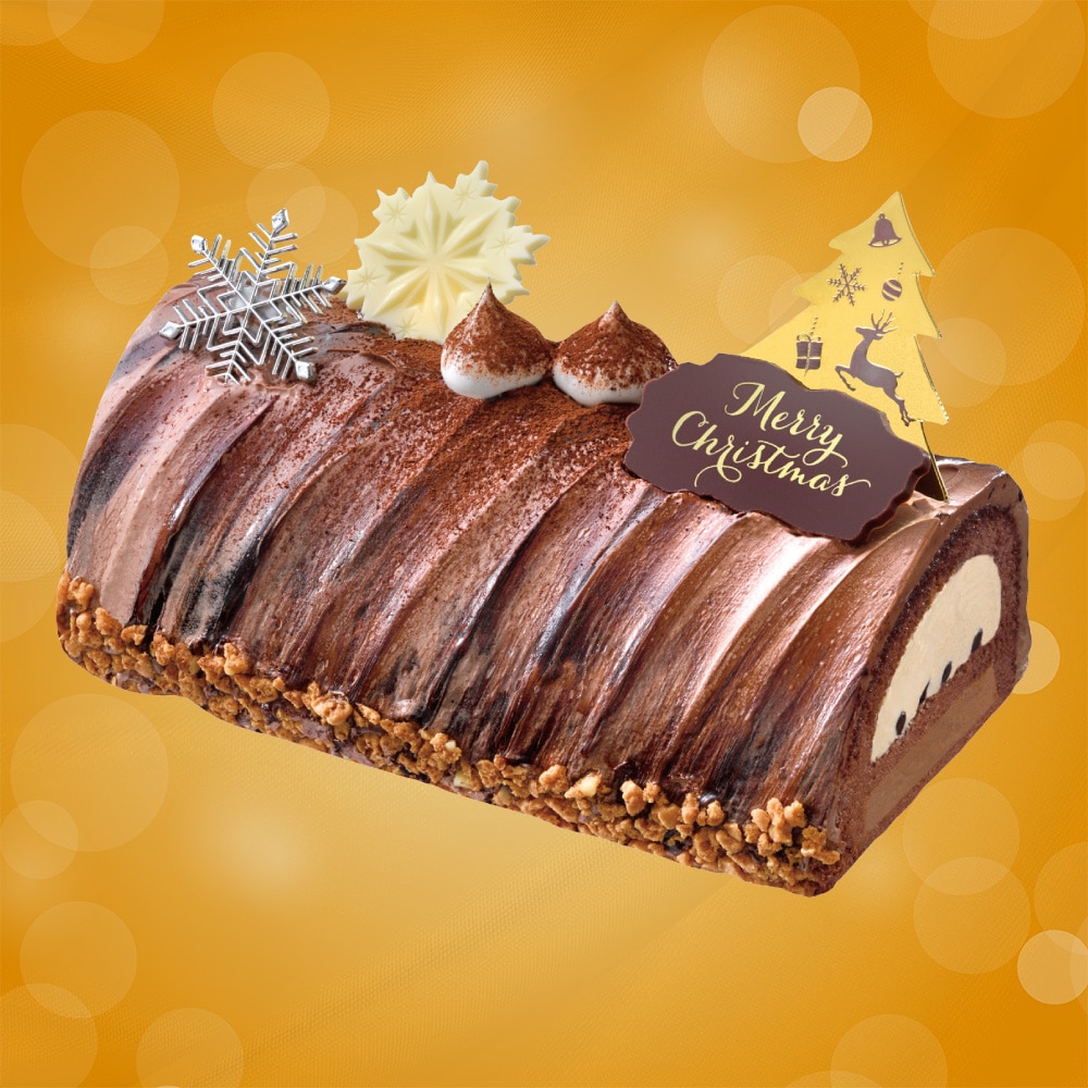 - ココアスポンジにキャラメルクリームとガナッシュ、チョコチップをサンドしたブッシュ・ド・ノエルです。