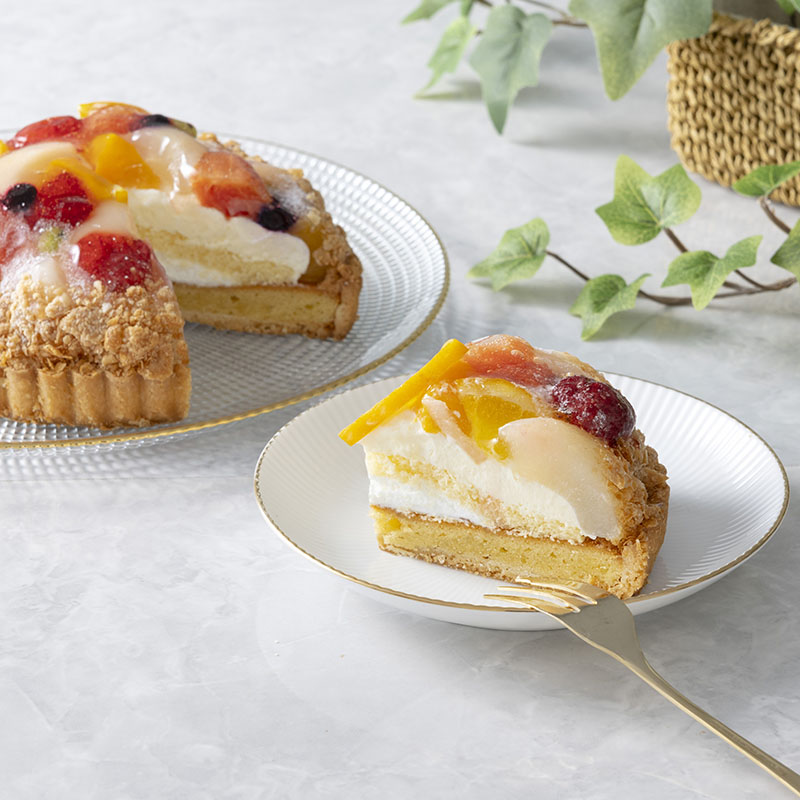 - 7種類のフルーツ(苺、黄桃、洋梨、オレンジ、キウイ、ピンクグレープフルーツ、ブルーベリー)をたっぷりと贅沢に盛り付けサクサクのパイを側面に散りばめたフルーツタルトです。