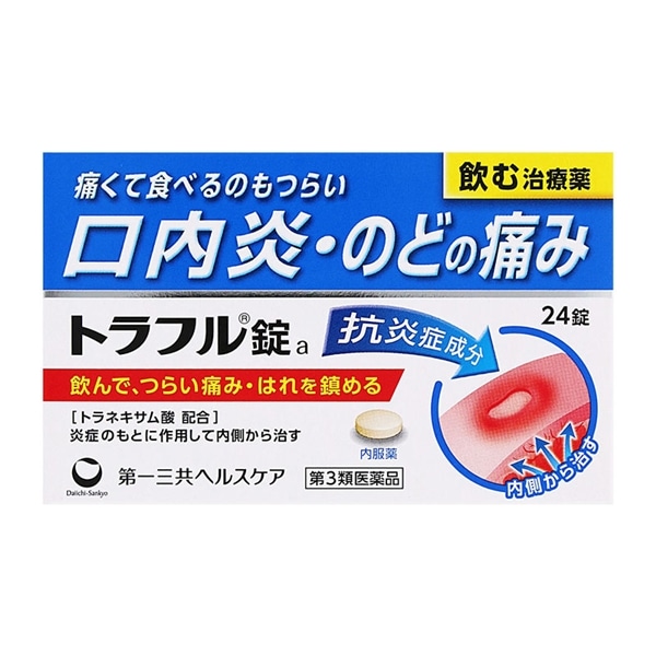 - トラフル錠aは、抗炎症成分トラネキサム酸を配合。炎症のもとに作用して、痛み・はれを鎮める内服タイプの治療薬です。