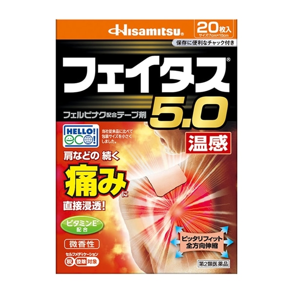 - ○効きめ成分フェルビナクを5.0%配合した、経皮鎮痛消炎テープ剤。