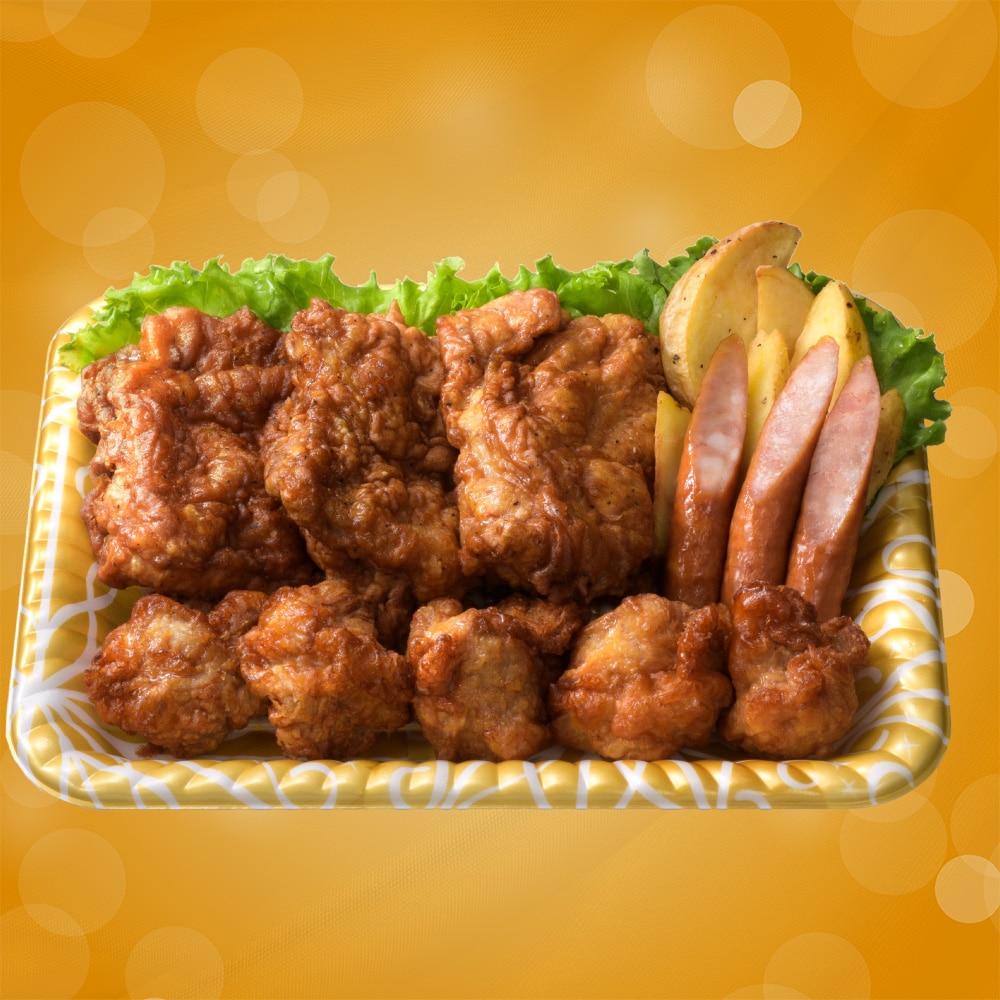 フライドチキンと唐揚げに加えて、ポテト、ウインナー等を添えて彩り良く盛り合わせました。