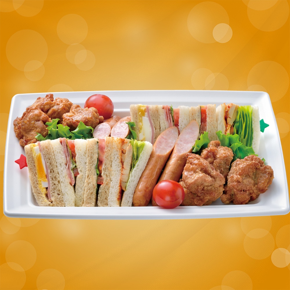 ハムたまご、ベーコンレタス、ローストチキン、ツナトマトの4種の層と唐揚げ、ウインナーを詰めました。