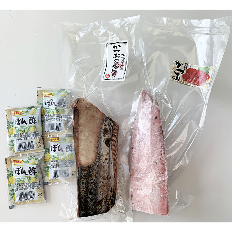 - かつお刺身170g、かつおたたき黒潮造り250g、ポン酢20g×4
