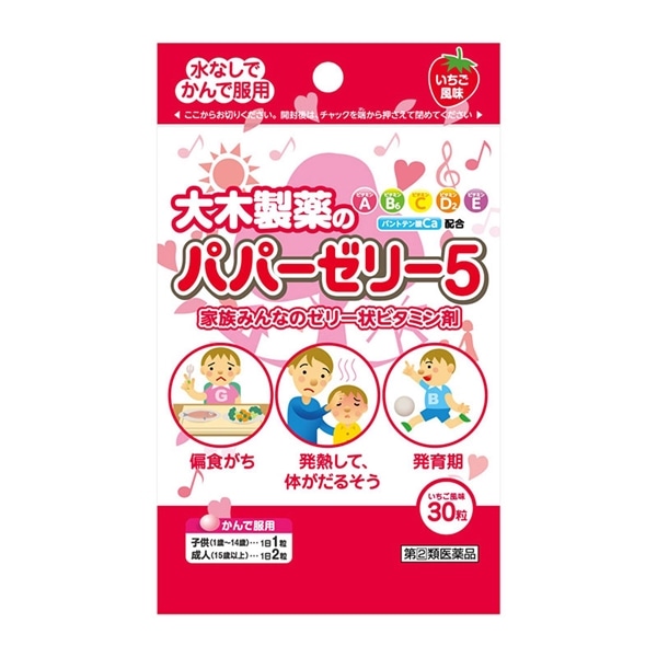 - パパーゼリー5は、ビタミンA、B6、C、D2、Eとパントテン酸カルシウムを配合したかんで容易に服用していただけるいちご風味の甘いゼリー状ビタミン剤です。お子さまが、かぜなどの発熱や下痢などでぐったりしているときや、食事が進まないときなどの栄養補給に適しています。偏食が気になる育ちざかりのお子さま、虚弱体質の方にもおすすめします。