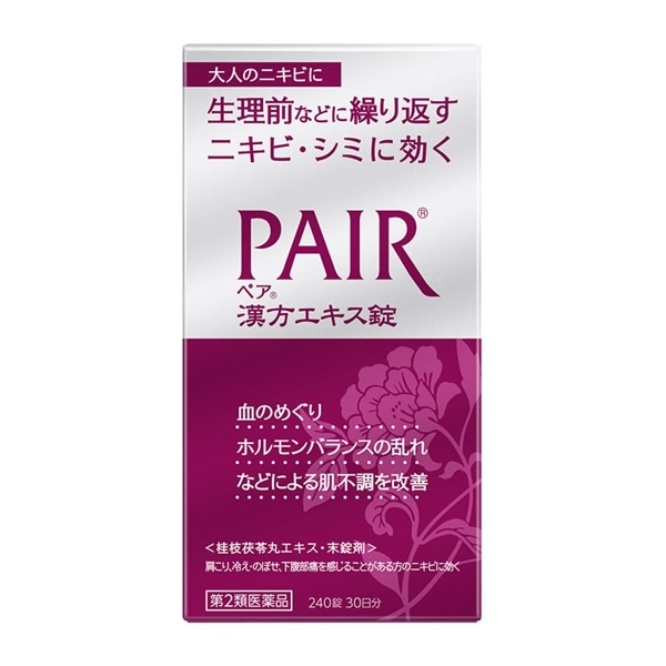 - 「ペア漢方エキス錠」は、5種の生薬からなる漢方「桂枝茯苓丸」のチカラで血のめぐりを改善。ホルモンバランスの乱れなどによるニキビ・シミをカラダの内側から治す漢方薬です。