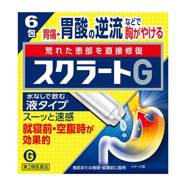 スクラルファートが荒れた患部に直接貼りついて、胃酸などの攻撃から保護するとともに、患部を修復して、もとから治していきます。