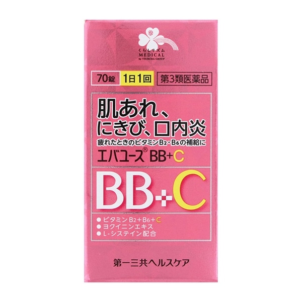 - エバユースBBプラスCはビタミンB2・B6・C等のビタミン類に加えアミノ酸や生薬成分を配合した肌あれ、にきび等のお肌のトラブルを改善し健康な素肌に保つビタミン剤です。