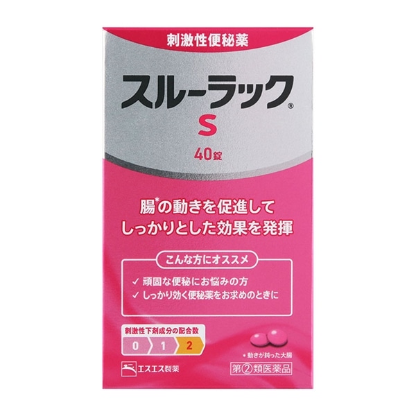 - ○スルーラックSは、2つの刺激性成分が腸のぜん動運動を促進。頑固でつらい便秘に効く刺激性便秘薬です。